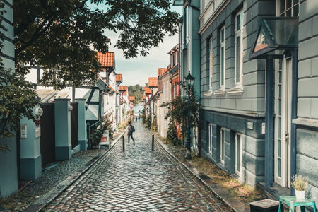 Flensburg, Germany - August 14, 2021: Oluf-Samson-Gang, a beautiful historic street in Flensburg with a view of the harbor