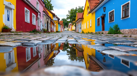 quaint village street reflects colorful houses after light rain.