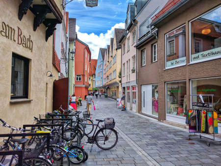 Memmingen, Bavaria, Germany - July 1, 2017 Colorful houses and bicycles on the streets of old town Memmingen