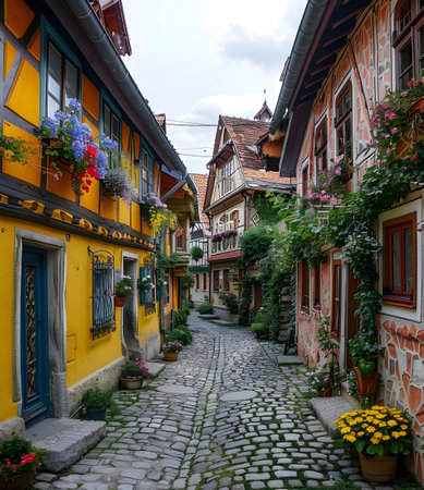 A narrow street with colorful half-timbered houses and cobblestone pavement