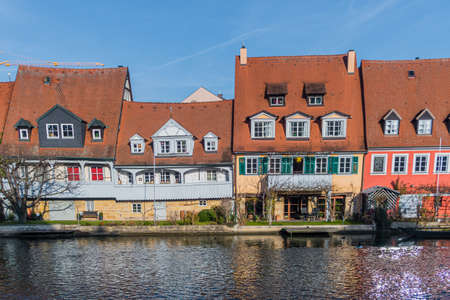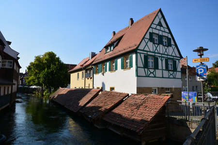 Beautiful view of the historical fishery Little Venice on the riverside of Regnitz on a sunny day in Bamberg, Upper Franconia area, Bavaria, Germany