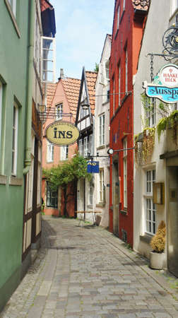 Bremen, Germany - Scenic view of medieval street Schnoor, half-timbered houses in the centre of the Hanseatic City, beautiful architecture, sunny day