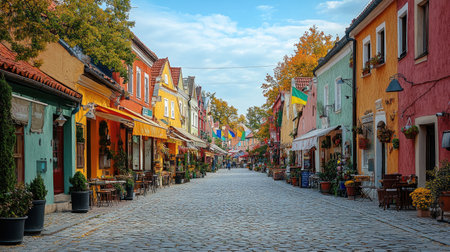 Beautiful cobblestone street in Sopocieścia, foreground of historic buildings and bustling small shops with outdoor seating, background of picturesque town square with flag shades of green, yellow, red, orange, and blue, early morning light casting long shadows over the quaint streetscape, high-resolution photography. --chaos 30 --ar 16:9 --stylize 750 --v 6.1 Job ID: 9acdb1a8-1f35-4029-b59d-0faeaef6376f