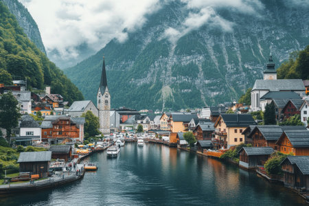 Serene View of a Calm River Reflecting the Charming Town of Hallstatt Amidst Majestic Mountains