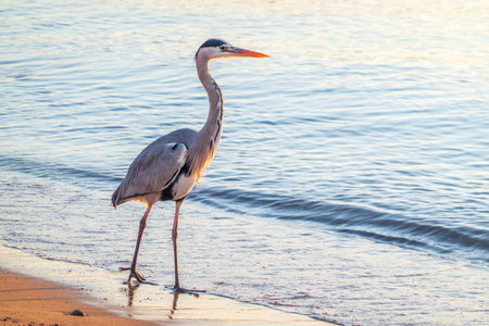 A heron hunting in the sea in the sunset or sunrise light. Gray heron on the hunt. Gray heron, Ardea cinerea