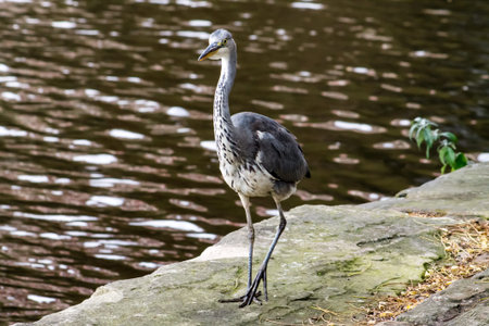 Closeup of a tall gray heron standing on rocks