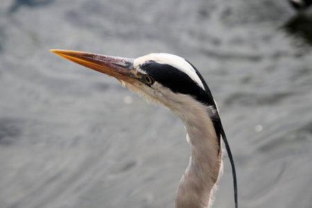 Head portrait of a gray heron sitting near a pond for food