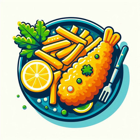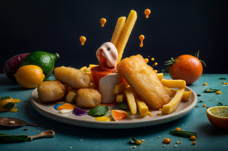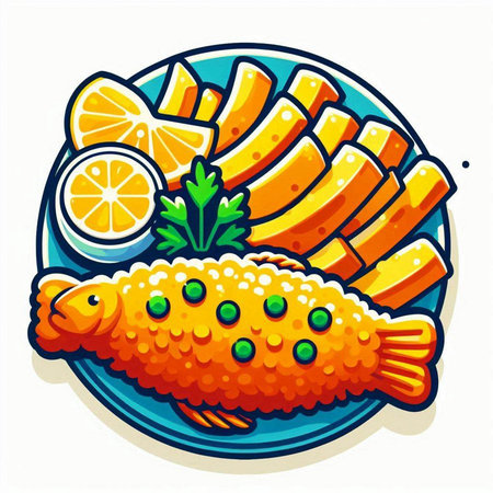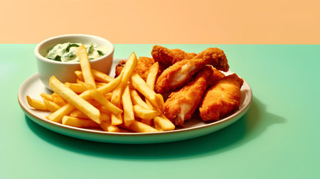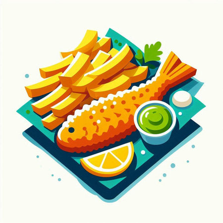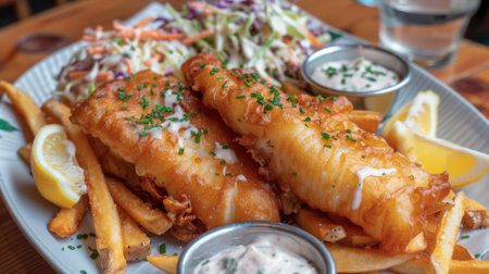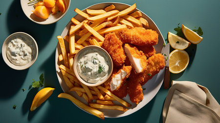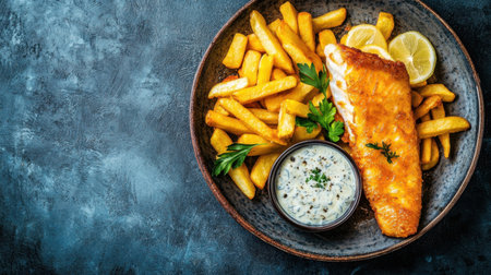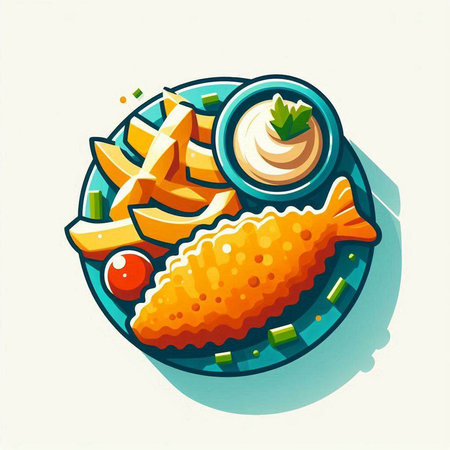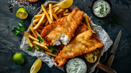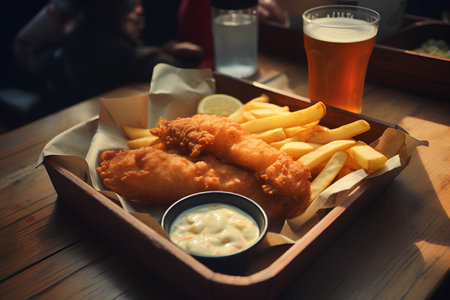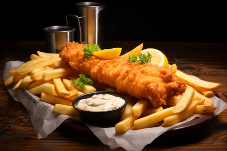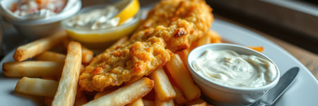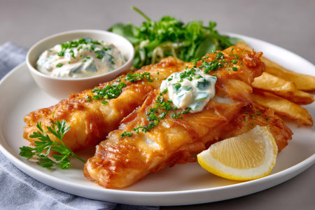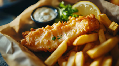 A classic British fish and chips dish with crispy battered fish fillets, fries, and tartar sauce.