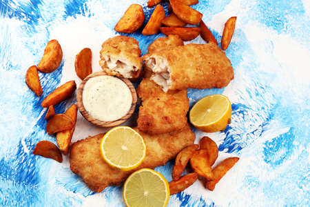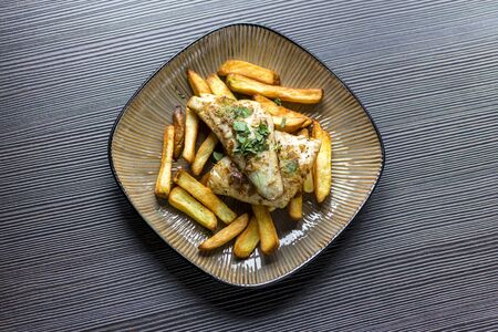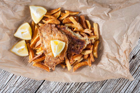 traditional British fish and chips consisting of fried fish, potato chips. fish to takeaway