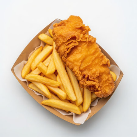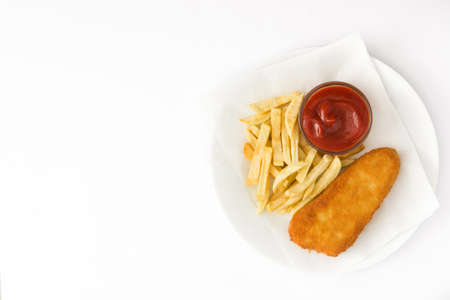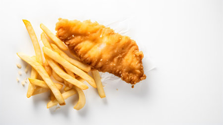Traditional British fish and chips isolated on white background.Top view copyspace