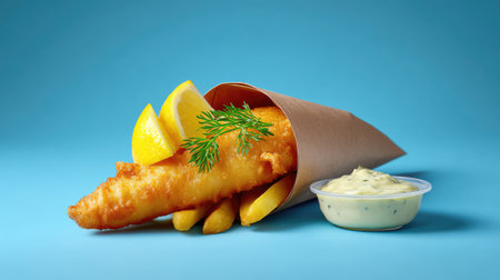 A delicious crispy fish fillet served in a paper cone with lemon wedges and creamy dill sauce, perfect for a satisfying meal or snack experience at any occasion.