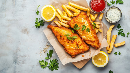 Deliciously crispy fish and chips served with fresh lemon slices and dipping sauces on a rustic surface