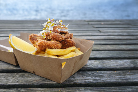 Fish and chips with lemon slice and sprouts in a cardboard box on a weathered wooden dock at the sea, copy space, selected focus