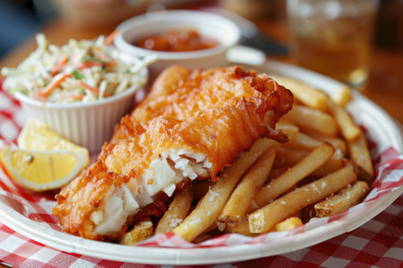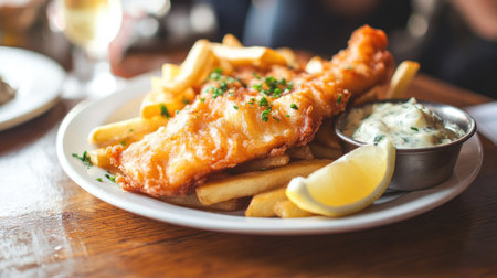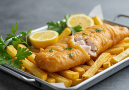 Delicious fish and chips with a crispy texture, served with lemon and dipping sauce