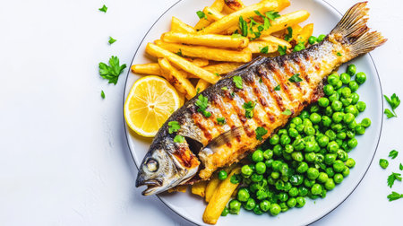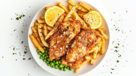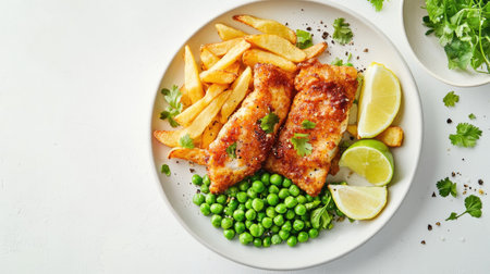 A vibrant plate featuring crispy fried fish served with fresh green peas and golden fries, perfect for a tasty meal or dinner. Ideal for food photography.