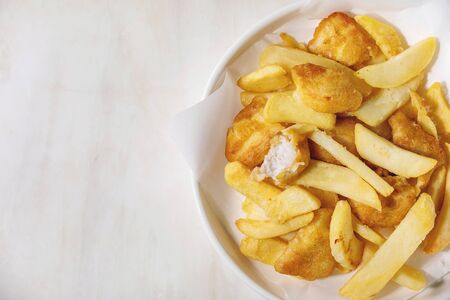 Classic british fast food fish and chips served on white paper in plate over white marble background. Flat lay, space