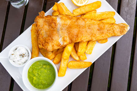 Traditional English Food such as Fish and Chips with green peas served in the Pub or Restaurant