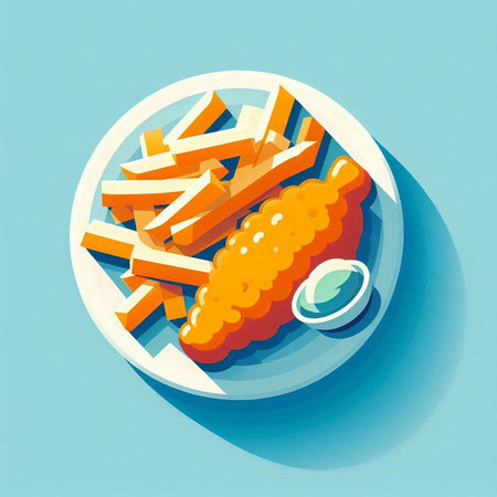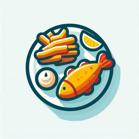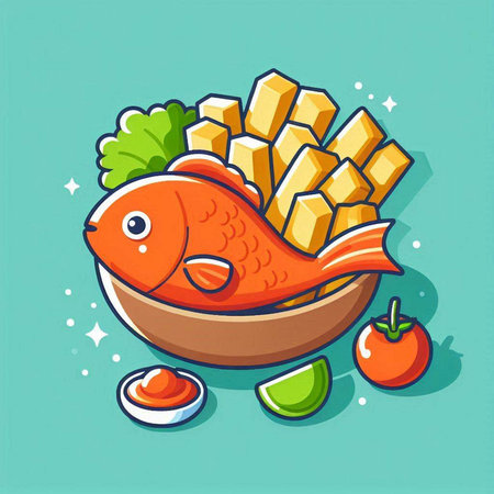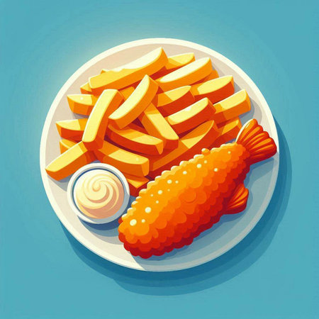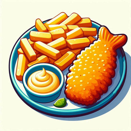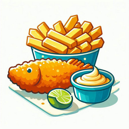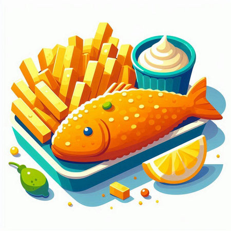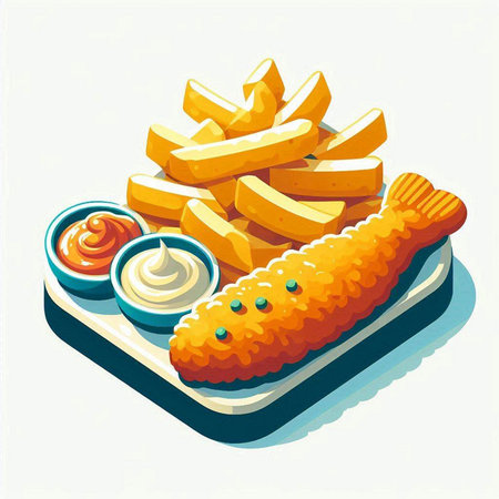 Illustration of fried fish and chips with ketchup and mayonnaise