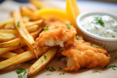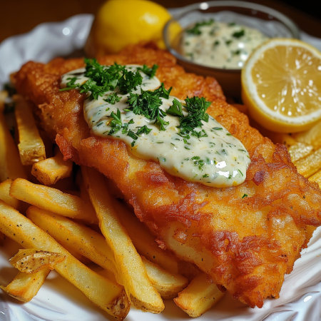 High-definition close-up of a serving of fish and chips with golden, crispy batter and a side of tangy tartar sauce, emphasizing the textures and appetizing details.