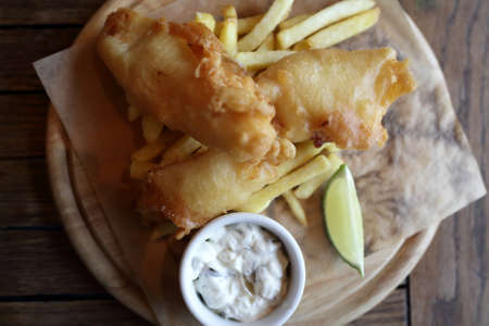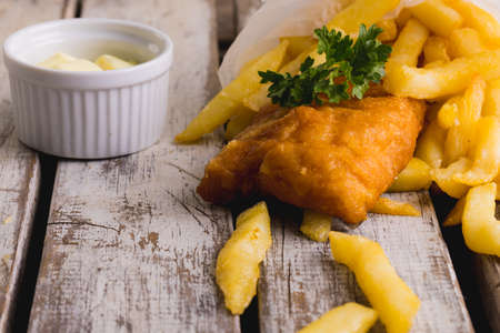 Fish and chips with tartar sauce on a wooden table. Selective focus.