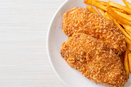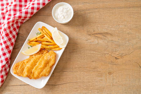 fish and chips - fried fish fillet with potatoes chips and lemon on white plate