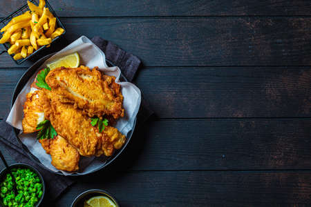 Fish and chips with green peas on a dark background, top view, copy space. British cuisine concept.