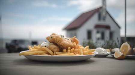 An AI generated illustration of a delicious plate of crispy fish and chips on a wooden table outside a traditional house, ready to be enjoyed