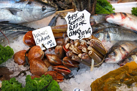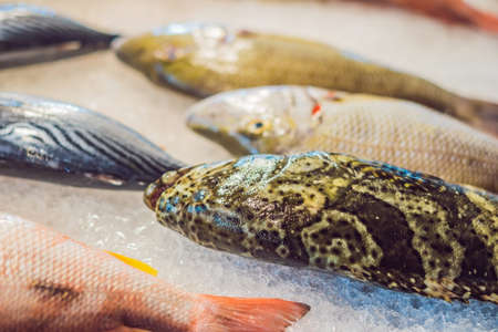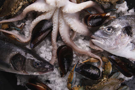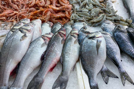 Fresh fish and seafood at fish market stall as seafood background. Variety of fresh seafood. Selective focus