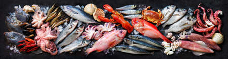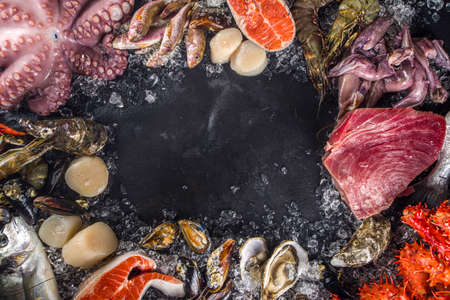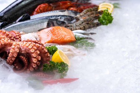 Variety of fresh luxury seafood, Lobster salmon mackerel crayfish prawn octopus mussel red snapper scallop and stone crab, on ice background with icy smoke in seafood market.