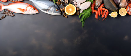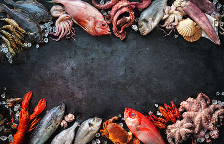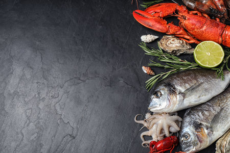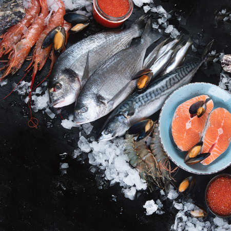 Assortment of fresh fish and seafood on dark stone background. Top view