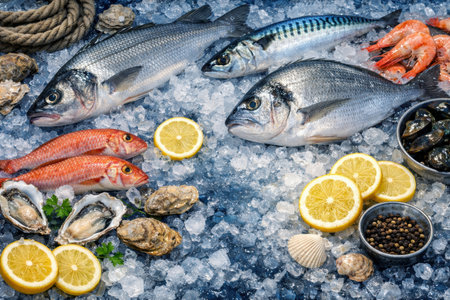 A variety of seafood is spread on ice, including fish, shrimp, and shellfish, arranged with lemon slices and herbs for a market display.