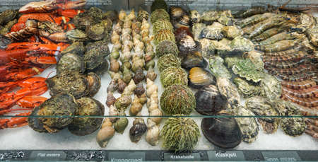 Rare seafood in a signature display case. Labels contain the name of the products.Scallops, shrimps, lobsters, shells, shells with mussels are laid out on ice on a store counter.