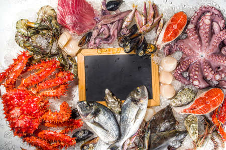 Assortment of fresh raw fish and seafood. Healthy and balanced diet or cooking concept. Top view, copy space, chalkboard
