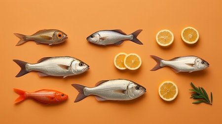 A variety of fish and vegetables are displayed on a table, including a lemon and a tomato. Concept of freshness and abundance, as the colorful fruits