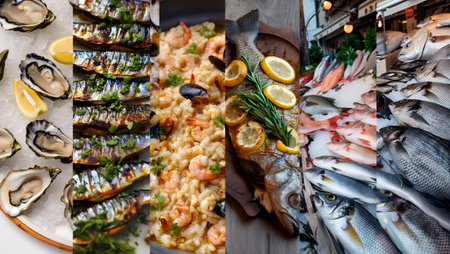 A vibrant display of fresh seafood including oysters, grilled fish, and shrimp dishes, garnished with lemon and herbs, showcasing culinary delights in a market setting filled with ambiance