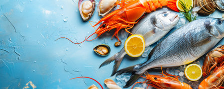 A beautiful display of various seafood items on a bright blue background, showcasing the freshness and diversity of marine life ideal for culinary inspirations and food photography.