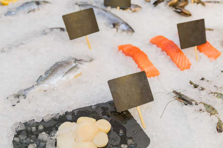Fresh seafood - Salmon, shrimp, fish and scallops - displayed on ice grocery store. Selective focus.