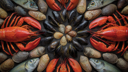 Fresh seafood arranged in an artistic pattern featuring lobsters, mussels, and various fish on a dark background