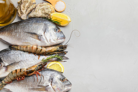 Fish assortment on light gray background. Mediterranean food concept. Flat lay, top view, copy space