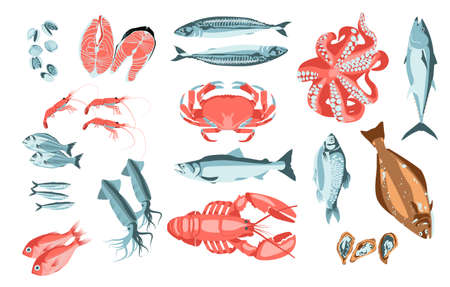 Fresh fishes and marine creatures set. Organic natural healthy nutritious seafood. Restaurant menu, fish market design cartoon vector illustration isolated on white background