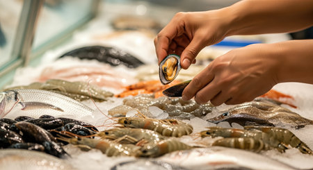 Hands are carefully selecting fresh seafood from an ice-filled display, highlighting the variety of fish, shrimp, and shellfish available in a bustling fish shop