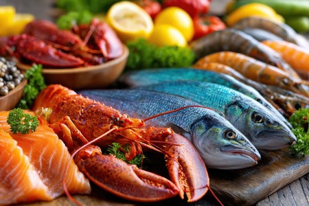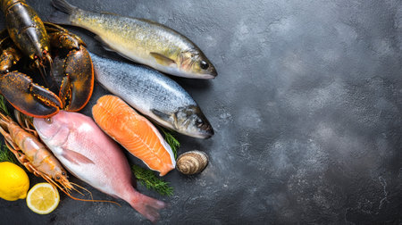 Assorted fresh seafood including lobster, salmon, and fish arranged on dark surface, highlighting vibrant colors and textures, perfect for culinary presentations