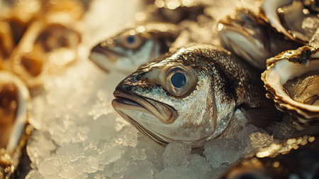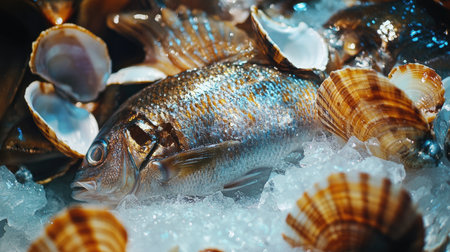 Close-up of fresh fish with shiny scales and shellfish on a bed of ice, creating a cool and appetizing display of seafood.