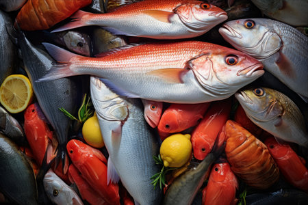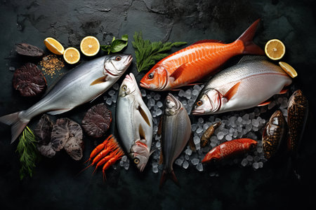 Fresh ocean fish and seafood at the fish market Close up Top view created with Generative AI technology.