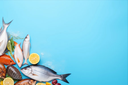 Splendor of Fresh Fish and Seafood: An Aesthetic Treat on a Blue Canvas -- AR 3:2