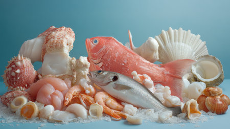 A vibrant arrangement of fresh seafood featuring colorful fish, various shells, and shrimp, set against a light blue background, perfect for culinary inspiration and food photography.
