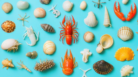 Vibrant collection of colorful seashells, crabs, and marine life arranged artistically on an aqua background, showcasing ocean biodiversity and inviting exploration and education.