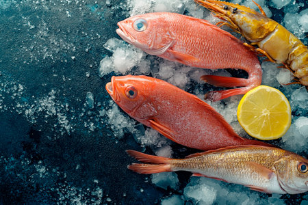Brightly colored fish and shrimp rest on bed of ice, showing their freshness. A slice of lemon adds a zesty touch, hinting at a delicious seafood feast to come.