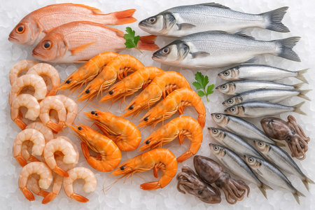 Fresh seafood assortment displayed on ice with fish, shrimp, and squid in a cool setting. concept of fresh ingredients, culinary art, seafood cooking.