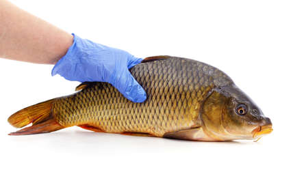 Hand holding fresh fish isolated on a white background.